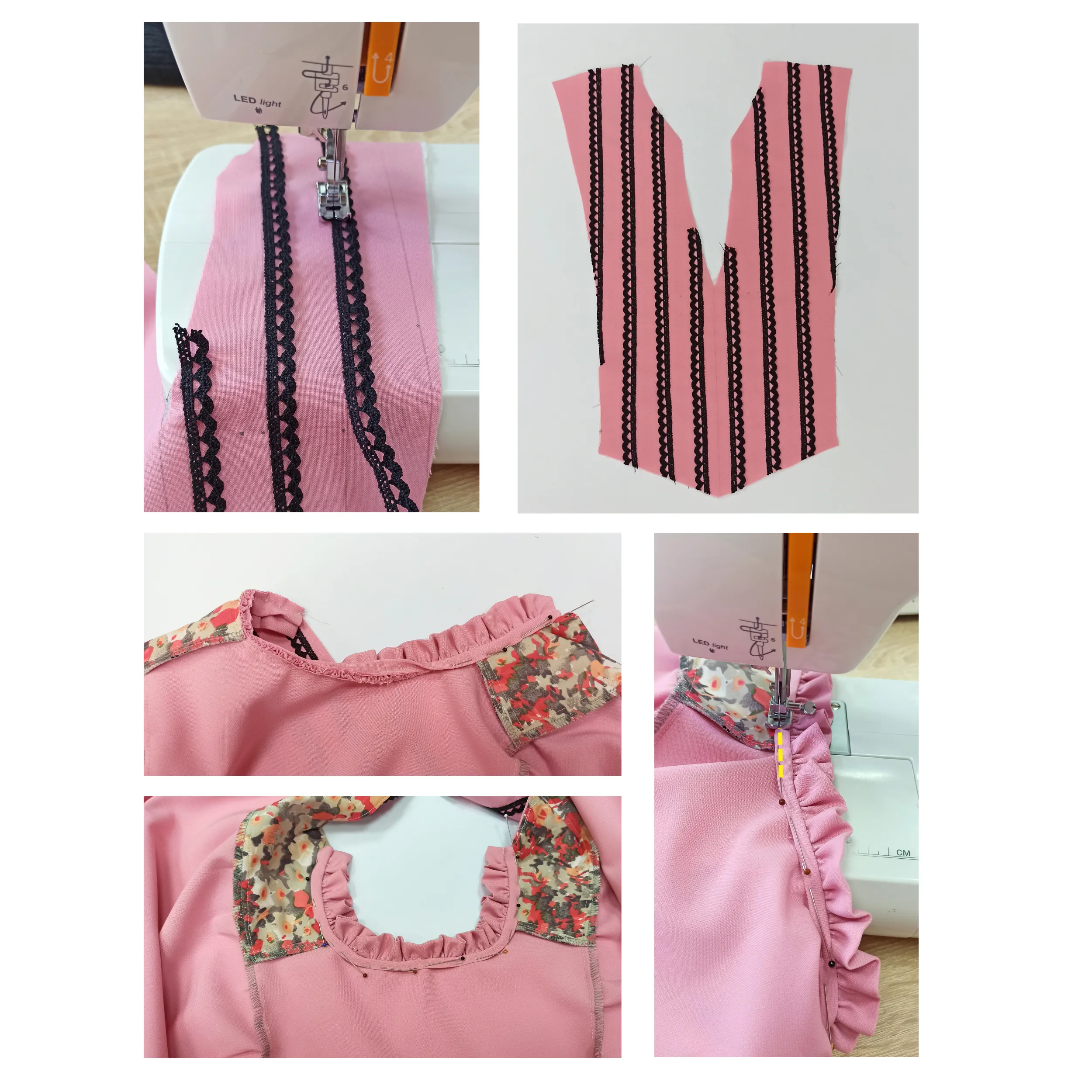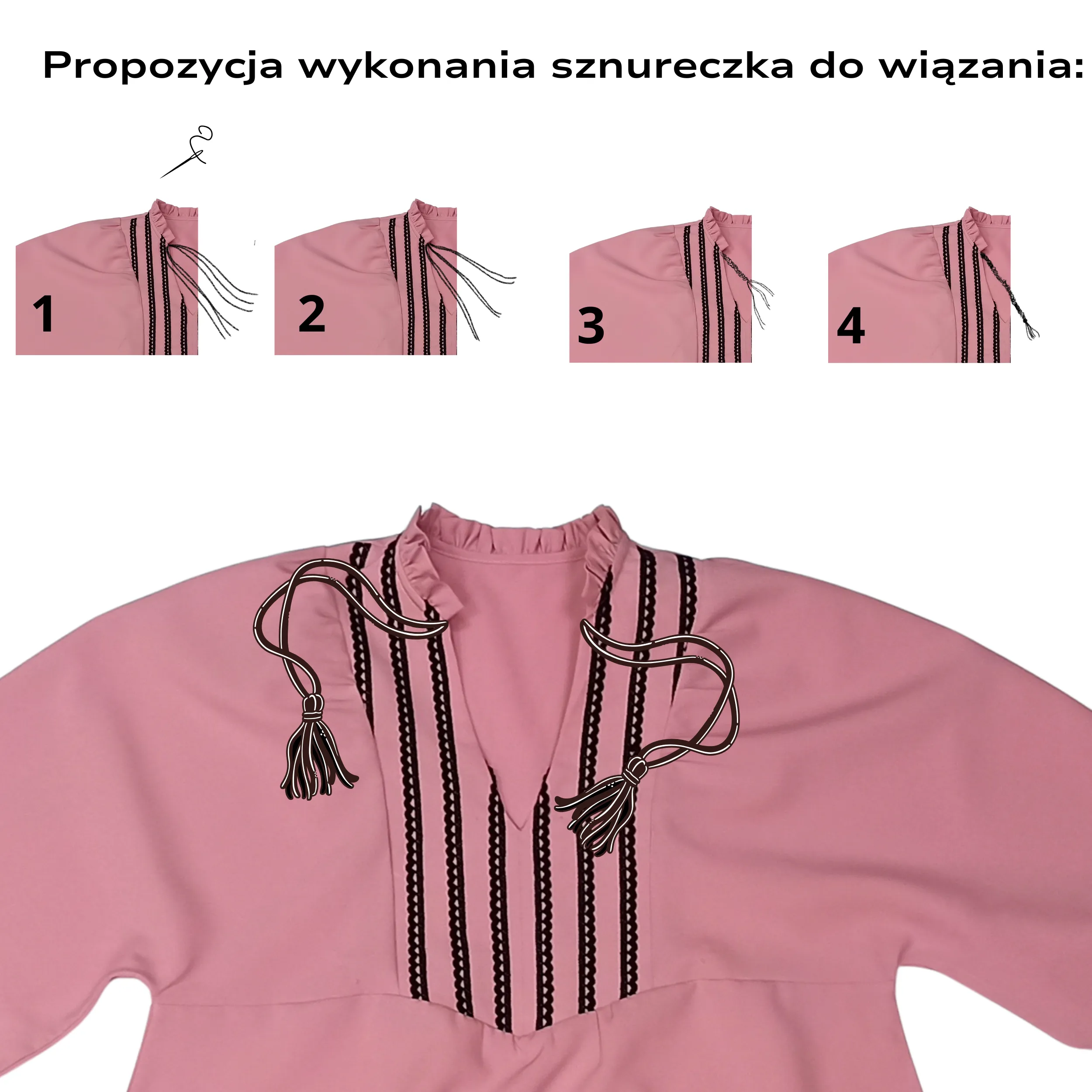 Do uszycia z tkanin: najlepiej z lekkich, miękko układających się tkanin, które ładnie współpracują z marszczeniem (np. wiskoza, batyst, cienka bawełna, delikatny len).